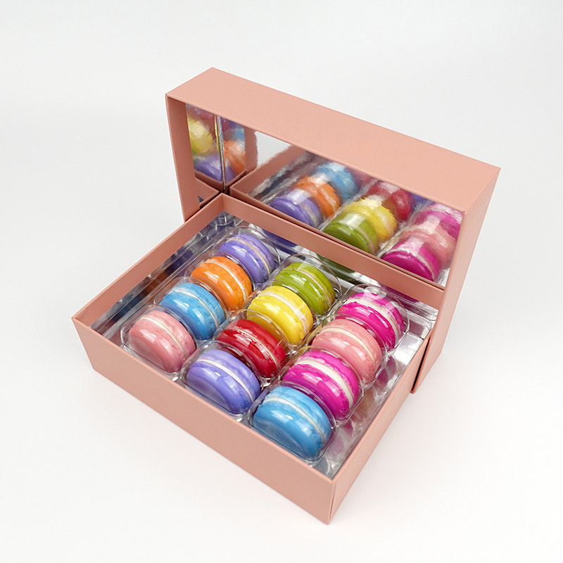 This macaron paper box can hold 12 macarons, made by high quality thick cardboard, no need to assemble. It comes with clear food grade plastic insert. Perfect as a display case for shop and holiday.Can custom printing design as your request.