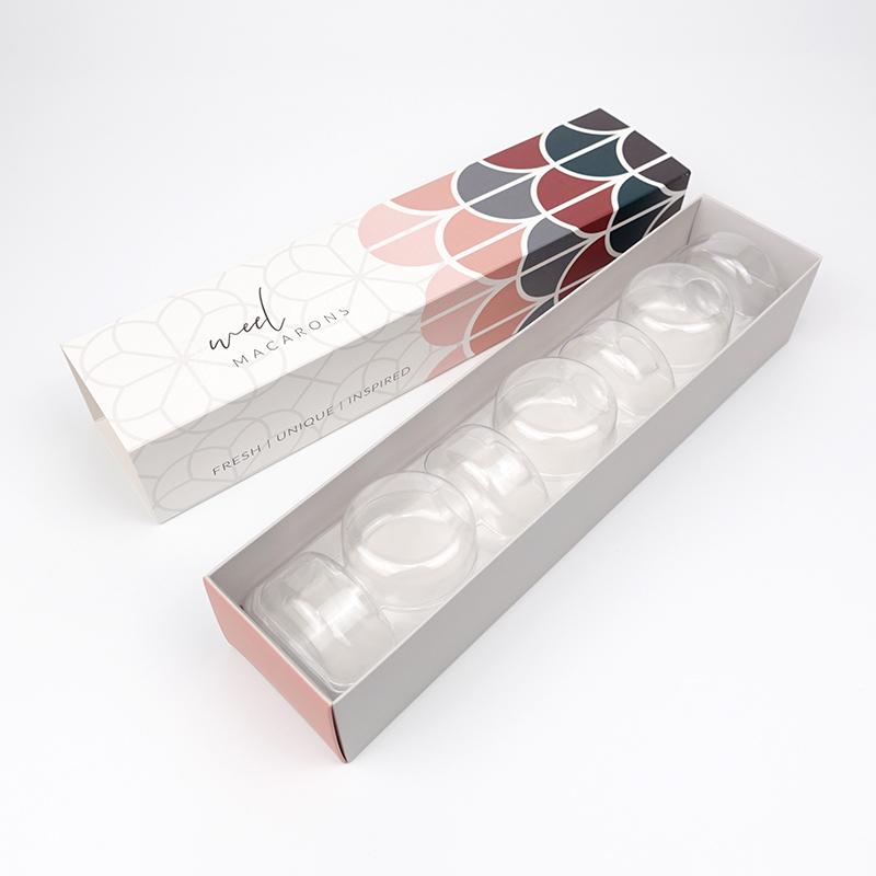 The macaron packaging box contains outside slid out drawer paper folding box and 2 pieces of clear plastic blister insert trays. The cavity size of insert tray is 48mm diameter*25mm width,if your macaron cookie size smaller than it that will work perfectly.