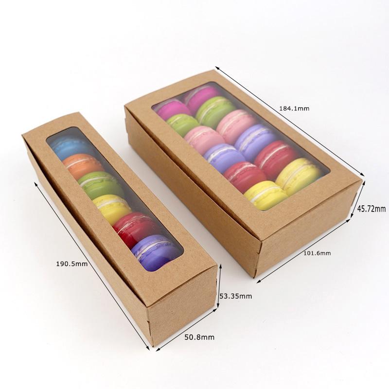 This paper macaron packaging is made of high quality kraft paper material.The box with clear window desigh can best display your beautiful macarons cookies dessert.We can add your own logo printing on the box to make the packaging more personalized.Also can be decorated with ribbon, the box is more delicate and beautiful as a gift box.