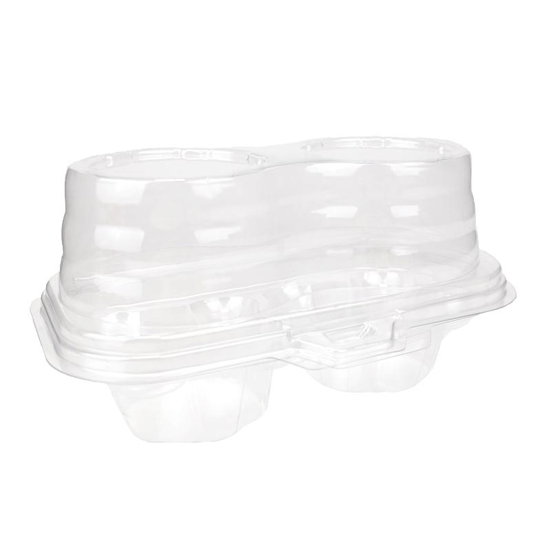 The clear plastic cupcake container can hold 2 cupcakes muffins.It is made of 0.55mm food grade clear PET plastic material, it's safe and recyclable.Clamshell type containers do not need to be assembled and can be used directly.