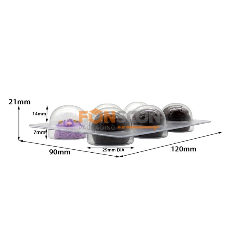 The plastic chocolate trays is made of food grade clear PET plastic material,the cavity size 29mm diameter.It can hold 6 pcs chocolate truffles candies.We can custom external transparent plastic box or paper box use together for the insert blister trays.