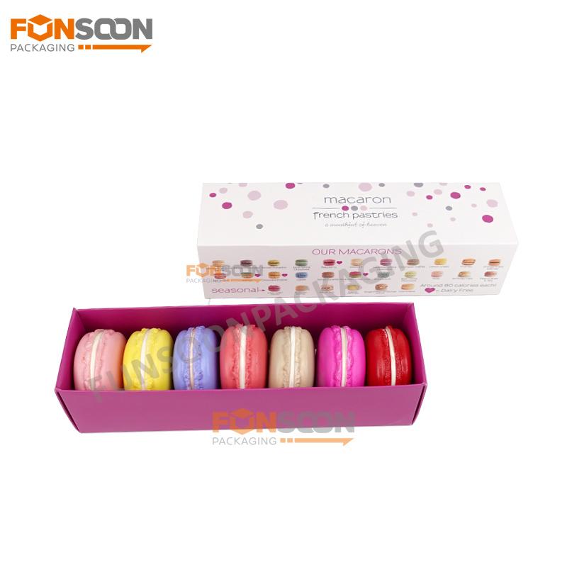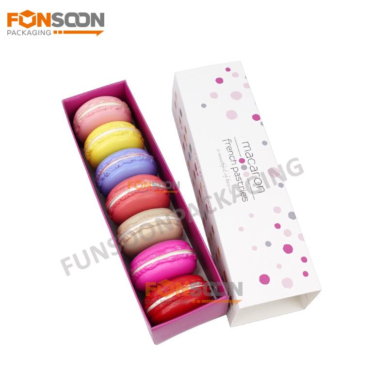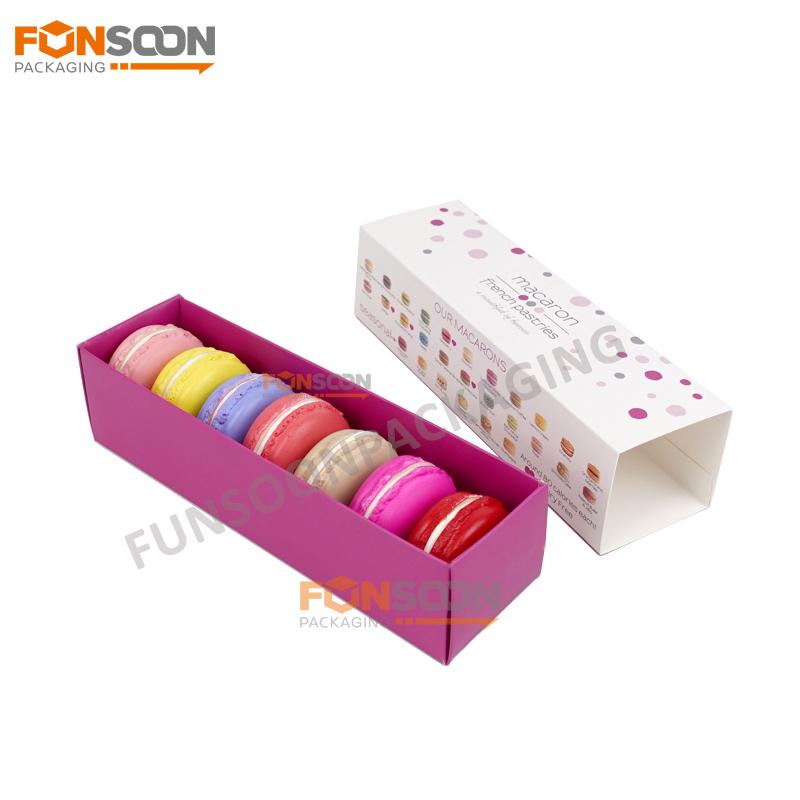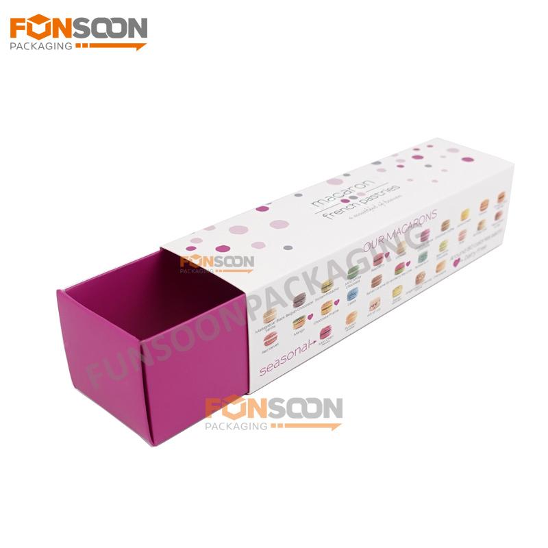 The paper drawer box can hold 6 pcs standard size macarons, and the box is slid drawer boxes is easy to assemble and place desserts. We can accept custom size and printing to meet different design requirements.