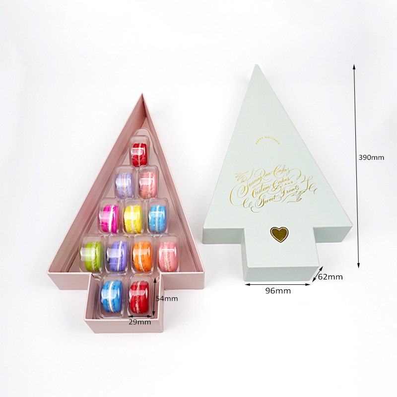 This 12 macaron Chirstmas gift box adopts 1200GSM paper, thick and durable. The unique shape of the Christmas tree is very festive. If you need customization we can design according to all your ideas.