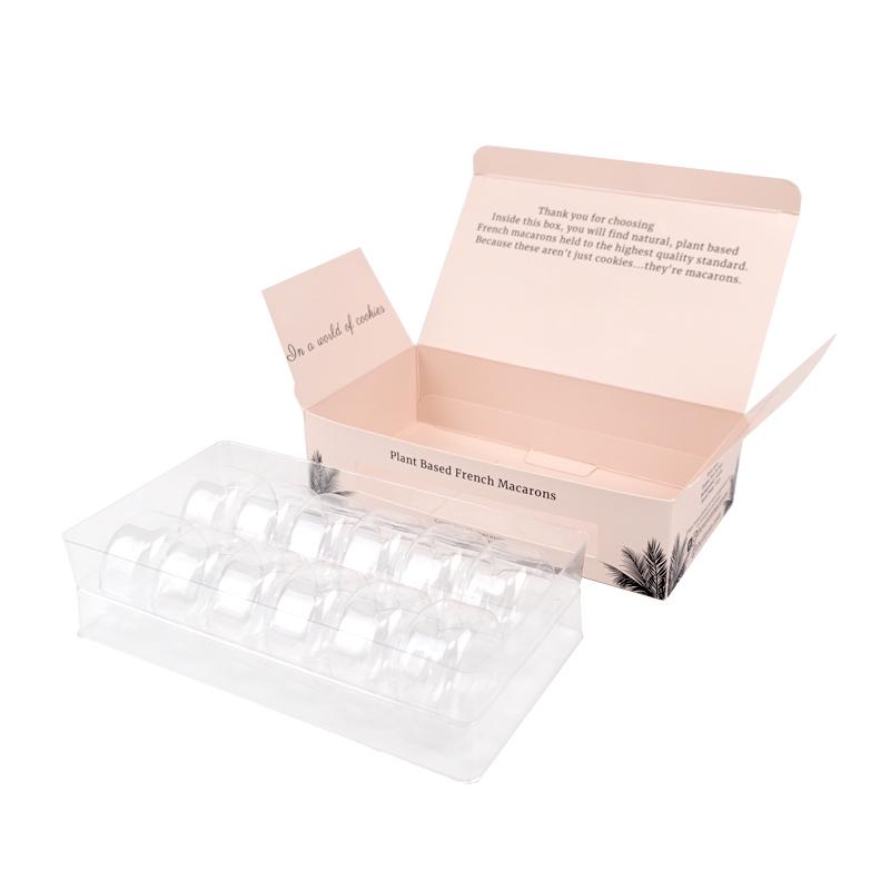 The Macaron Cookie Box is paper folding box style and made of food grade ivory paper material,safe and recyclable. Folding box type to save storage space, and it is easy to assemble. A set box contain outer printed paper box and 2 pcs plastic blister insert trays.