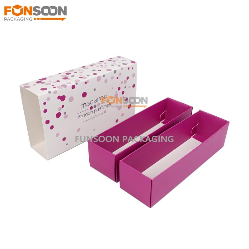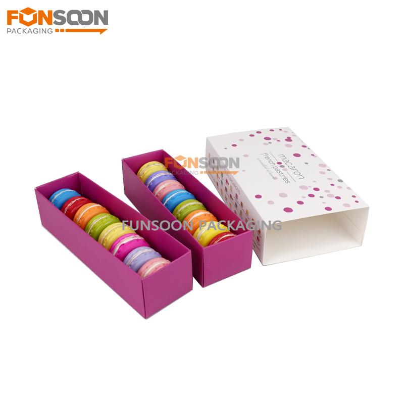 The drawer box packaging can hold 12 pcs standard size macarons, and the box is slid drawer boxes is easy to assemble and place desserts. We can accept custom size and printing to meet different design requirements.
