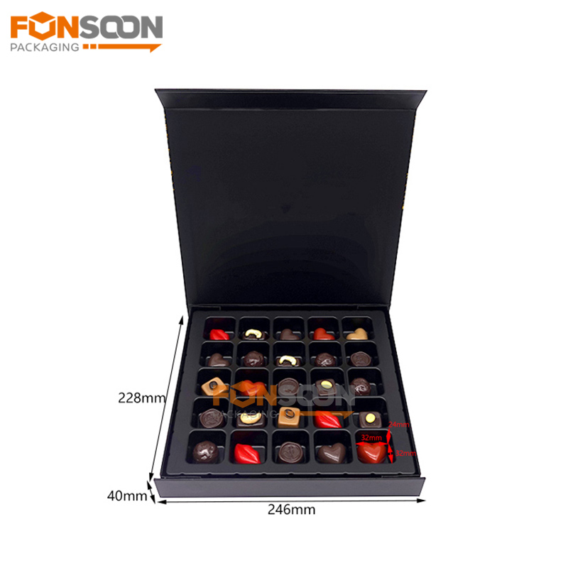 The cardboard chocolate box is made of 1200gsm rigid cardboard material,the box close with magnet lid deign,it can be used directly without assembly.We support custom box size,designs and printing according to all your requirements.