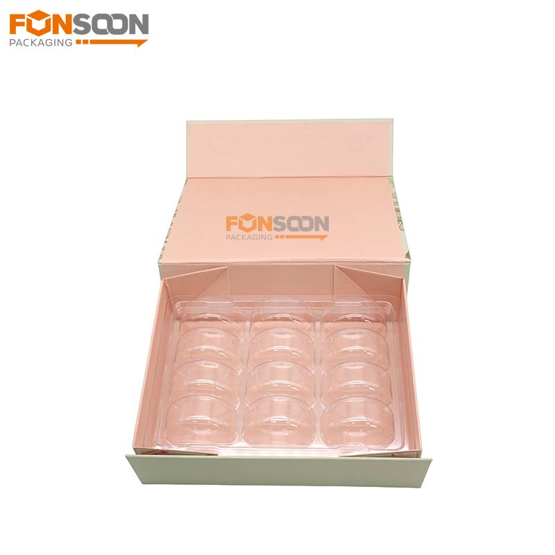 Inside the cardboard box with magnetic lid, a custom food-grade clear PET blister insert tray is precisely thermoformed with 49 × 25 mm cavities, ensuring each macaron fits securely in place. The sealed blister design minimizes movement, prevents damage, and maintains product presentation, making it ideal for fragile desserts that require reliable protection during shipping or display. Structured inserts are commonly used in premium packaging to keep products neatly arranged and visually appealing upon opening.
