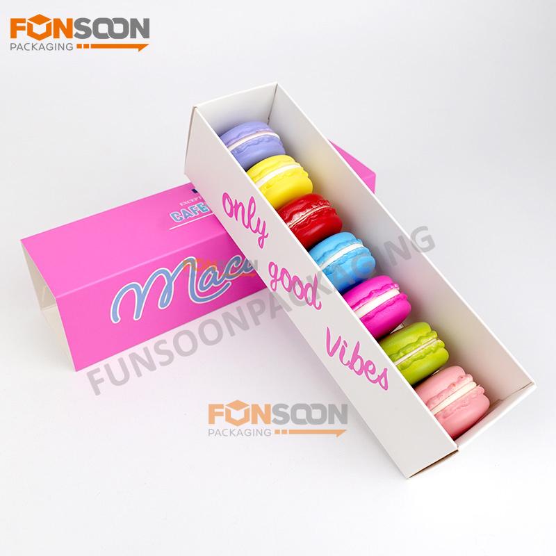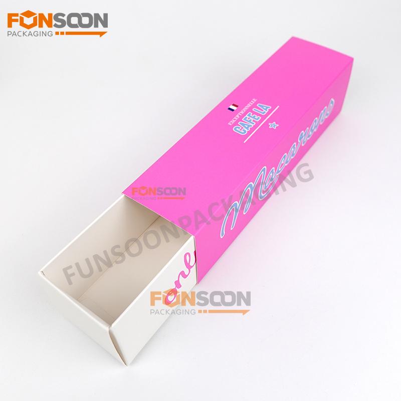 The macaron paper box can hold 6 pcs standard size macarons, and the box is slid drawer boxes is easy to assemble and place desserts. We can accept custom size and printing to meet different design requirements.